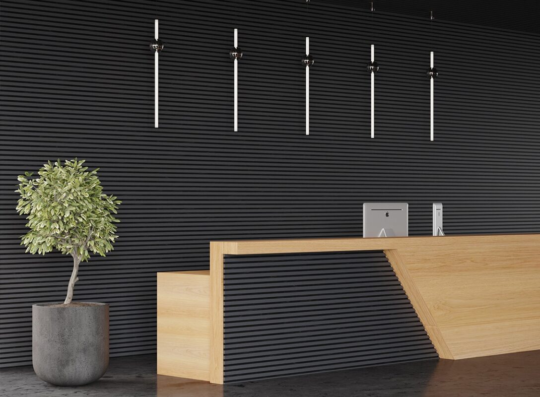 Ribbon Design är våra akustikpaneler gjorda i material som liknar olika metall-, sten- och cementvarianter. De är avsedda för rum där man vill ha en avskalad känsla, utan att behöva störas av det eko som annars uppstår när ljud studsar mellan hårda ytor. Med Ribbon Design får du det bästa av två världar! Ribbväggarna är enkla att montera, och installationsarbetet kräver inga speciella förkunskaper.